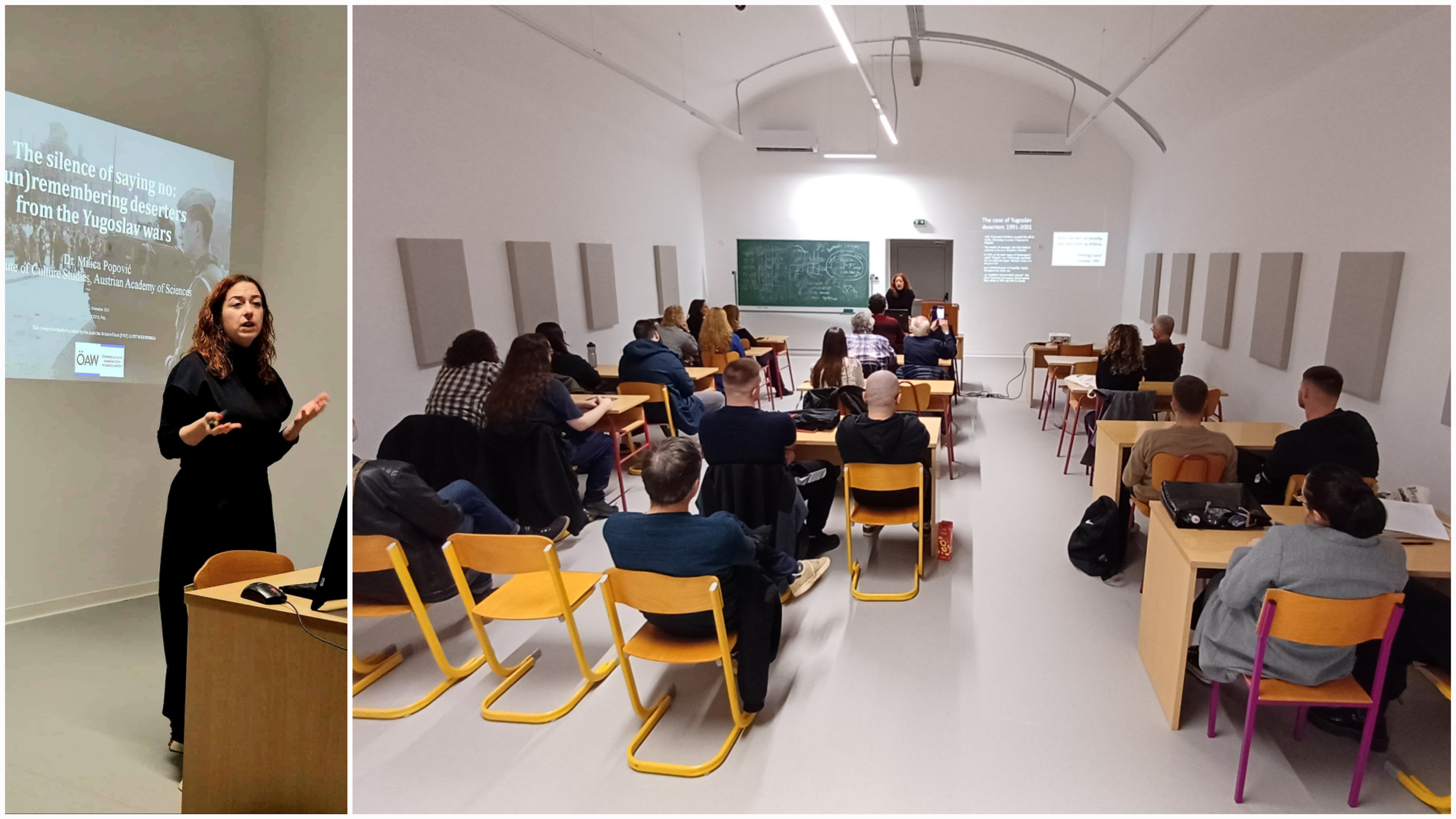 U organizaciji CKPIS-a – u srijedu, 12. studenog 2025., u 16.00 sati u dv. 221 na Filozofskom fakultetu (Negrijeva 6, prvi kat, lijevo krilo) – gostujuće javno predavanje pod naslovom Tišina odbijanja: (ne)zaborav dezertera iz jugoslavenskih ratova održala je dr. sc. Milica Popović s Austrijske akademije znanosti u Beču.